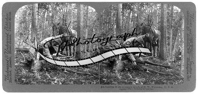 Photo of Stereograph,Elk Hunting,Mountain Woods,Wyoming,WY,c1904,Hunters