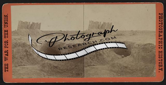 Summary: Stereograph showing gabions and other fortifications inside a Confederate fort near Petersburg.