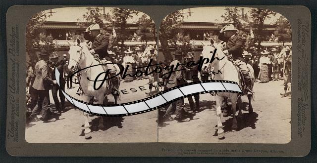 Summary: showing Roosevelt tipping his hat to a passing naval parade while standing on the deck of the Mayflower with Dewey and Moody, off Oyster Bay, Long Island, New York.