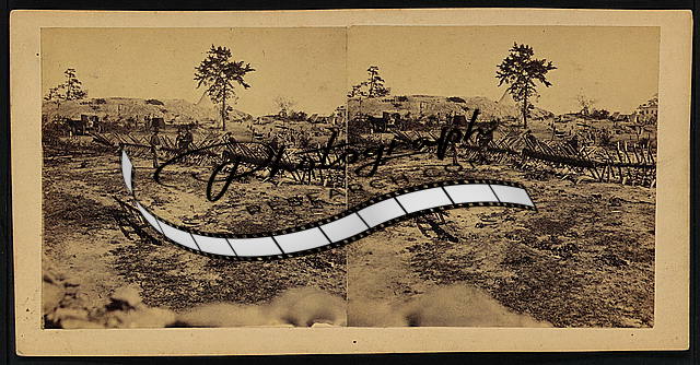 Summary: Photograph shows war damaged chevaux-de-frise in a former Confederate fort near the Western & Atlantic railroad.