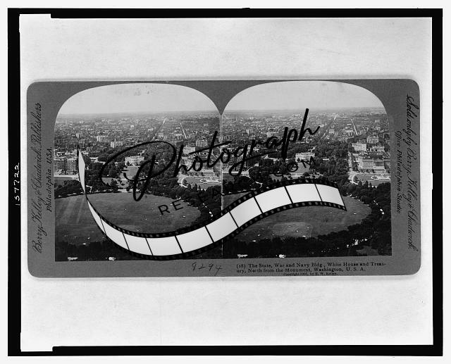 Summary: 8x12 inch Reproduction Photograph showing a bird's-eye view, looking east, of the White House, with the south portico on the right and the Treasury building in the background.