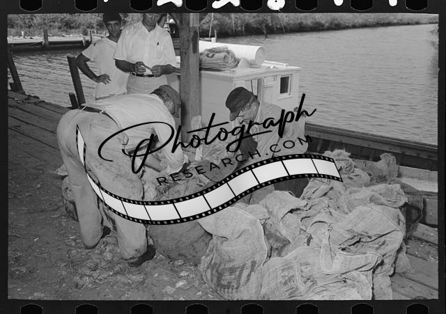 Tying sacks of oysters,Olga,Louisiana,LA,Farm Security Administration,FSA