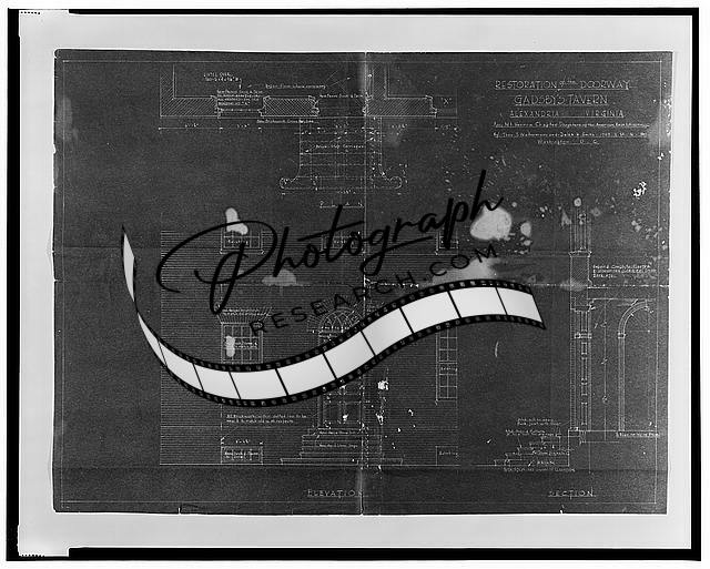 Restoration of a tavern ("Gadsby's Tavern") for Mount Vernon Chapter, Daughters of the American Revolution, Alexandria, Virginia. Doorway plan-elevation-section