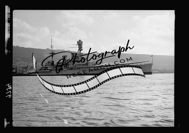 Title: Haifa, result of terrorist acts & government measures. H.M.S. Repulse taken from the docks, marine on guard below British flag