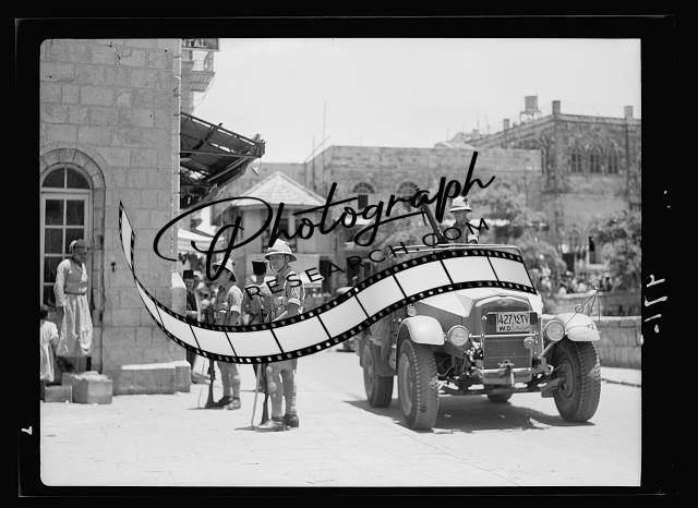 Title: Result of terrorist acts & government measures. Military raid for arms on Jaffa Gate section, July 13, '38, showing army cars with machine guns