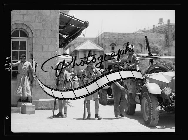 Title: Result of terrorist acts & government measures. Military raid for arms on Jaffa Gate section, July 13, '38. Battery of armoured cars in Julian Way