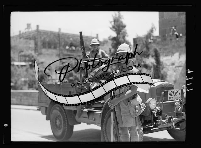 Title: Result of terrorist acts & government measures. Military raid for arms on Jaffa Gate section, July 13, '38. Battery of armoured cars in Julian Way
