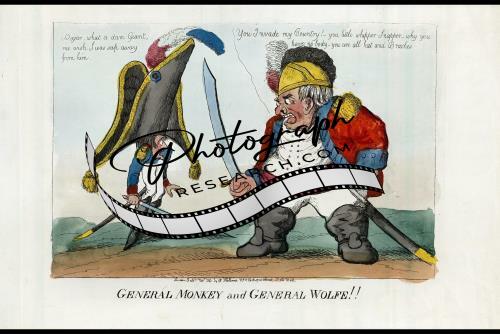Summary: Print shows Napoleon I coming ashore at Calais, France, defeated at every turn, without men and ships, to face the ridicule of fisherwomen, the governor, a French soldier, and an English sailor who says, 'Take one kick at parting & thank your own insignificance the English suffer'd you to return to France alive.'