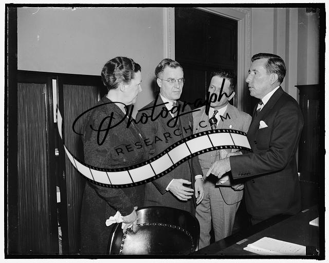 Title: RFC Head tells House Committee 10% down payment on purchase of house is adequate. Washington, D.C., Dec. 1. RFC Chairman Jesse Jones pounds his fist to emphasize a point as he assures the House Banking and Currency Committee that the 10% down payment on the purchase of a home contemplated under President Roosevelt's recommended housing amendments is not too low. Rep. Henry B. Steagall, Chairman of the Committee, is shown in the background, 12/1/27