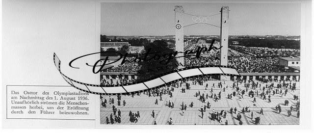 1936 Olympic games - Berlin (GV922-C5, v. 2): birds-eye view of east gate of olympic stadium, Aug. 1, showing large crowd
