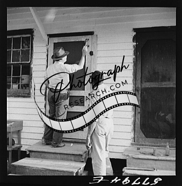 Title: Door ready to be placed. Demonstration of home screen door construction. Saint Mary's County, Ridge, Maryland