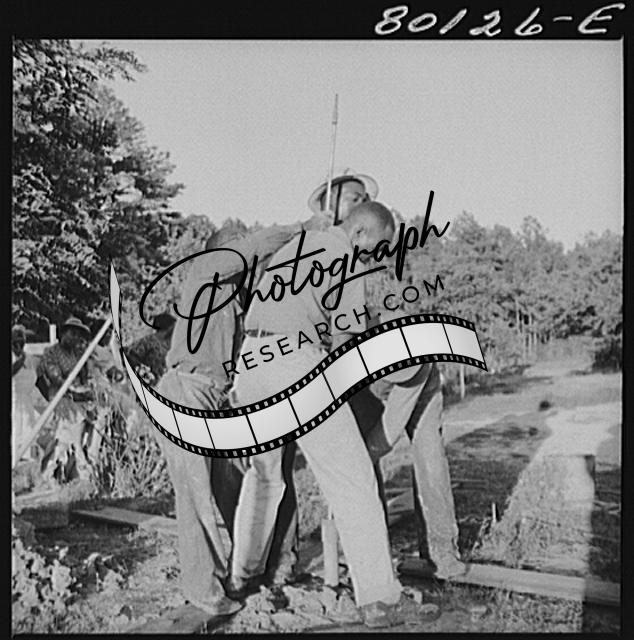 Title: Tamping in earth around top of pump after fill of gravel has been poured around the casing. Ridge well project, Saint Mary's County, Maryland