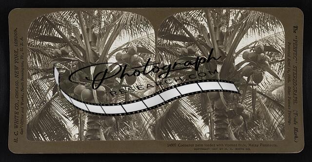 Cocoanut palm loaded with ripened fruit, Malay Peninsula