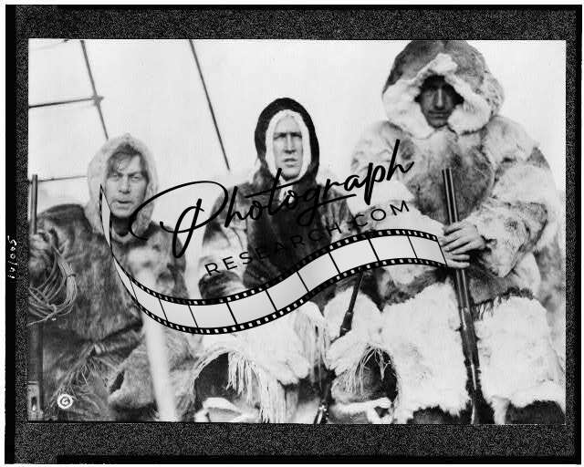 Men,fur parkas holding guns,ship during Arctic expedition,surveys,explore,c1913