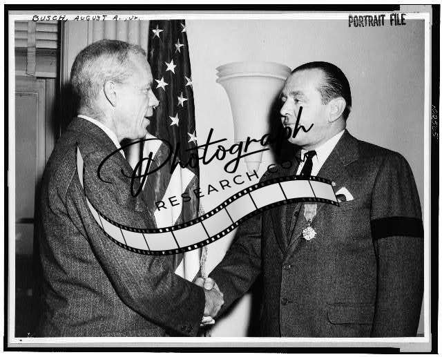 August A Busch Jr, receiving medal,merit,War Secretary R Patterson,service,1946