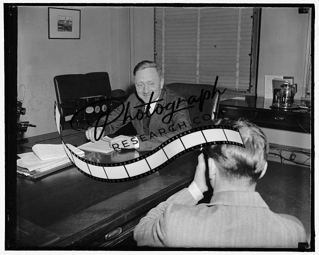 Title: $7,300,000 sought for training civilian pilots. Washington, D.C., March 20. Robert Hinkley, left, a member of the Civil Aeronautics Authority, today declared before the House Ways and Means Committee that the aggressor nations had 'Startled us into action' as he sought for the CAA an appropriation of $7,300,000 for the training of civilian air pilots. He is shown with Rep. Clarence F. Lea Chairman of the Committee, 3-20-39