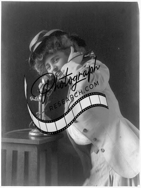 Woman holding up telephone receiver,coat,hat,clothing,communication,c1907