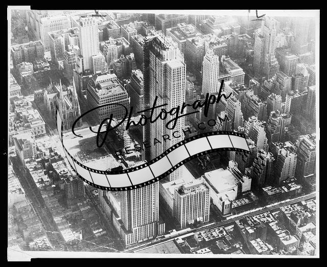 Summary: Photograph shows aerial view of mid-town Manhattan during construction of Rockefeller Center.