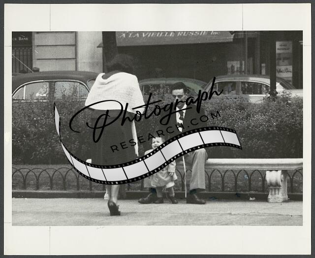 [[Woman walking towards a man sitting on a park bench with a child]] / Photograph