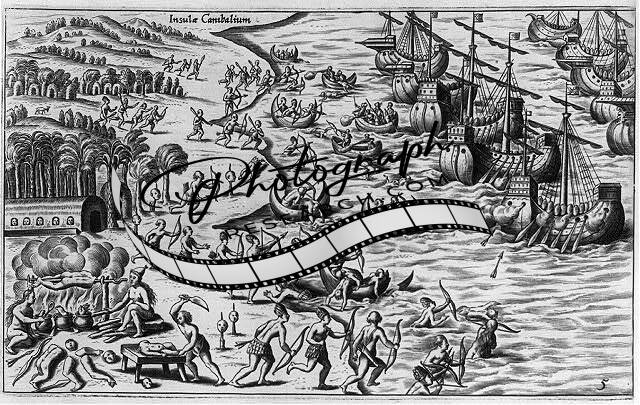 'Insula Canibalium',Indians attacking fleet of Spanish ships;cannibalism,1492
