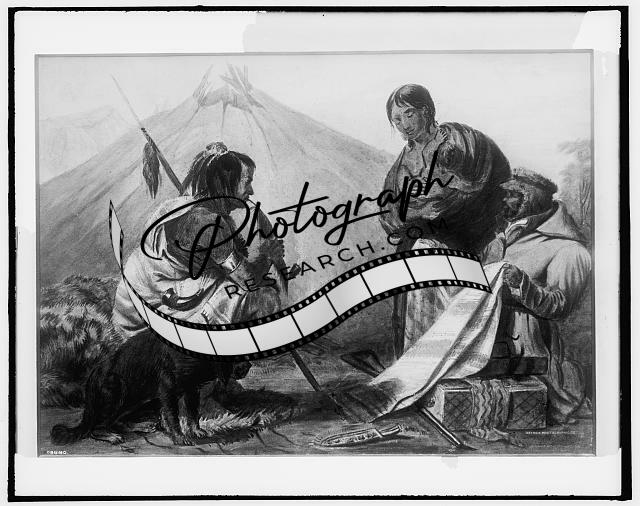 Indian man,woman,child,trader showing blanket,Detroit Publishing Company,1900