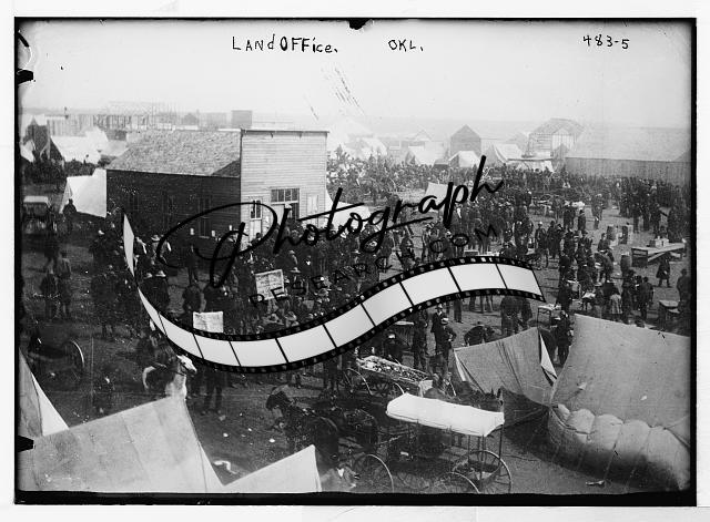 Land rush,Oklahoma,OK,horse-drawn carriage,signs,buildings,Land Office