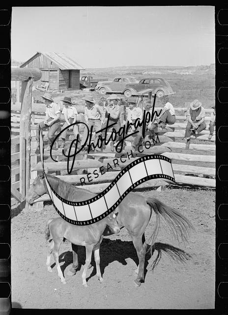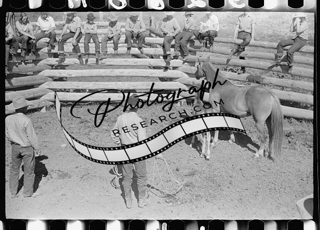 Branding a colt,Quarter Circle U roundup,Montana,MT,June 1939,Rothstein,FSA