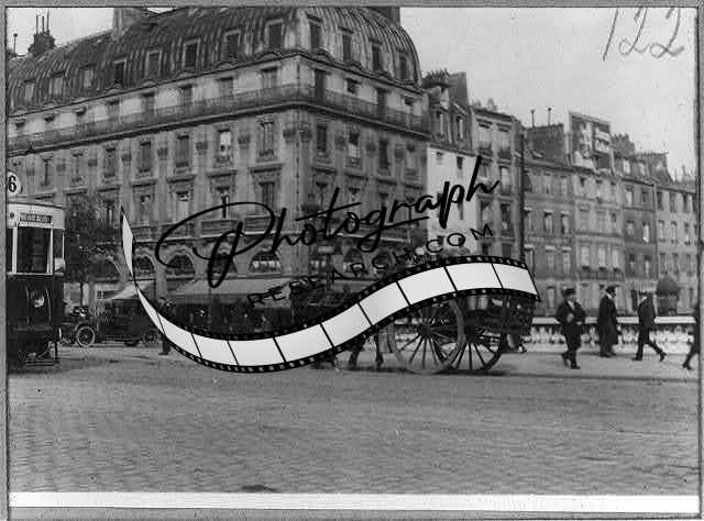 Paris,France,ca. 1920,Street scene,milk wagon,trolley car,people,buildings