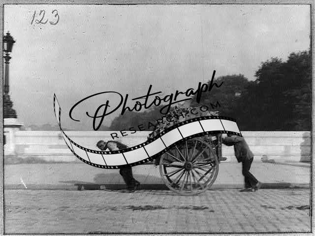 Paris,France,ca. 1920,2 men pulling & pushing rag cart,street lamp