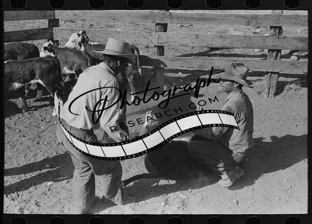 Title: Throwing a calf before branding. Roundup near Marfa, Texas