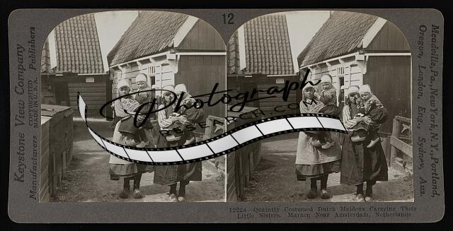 Quaintly costumed Dutch maidens carrying their little sisters. Marken near Amste