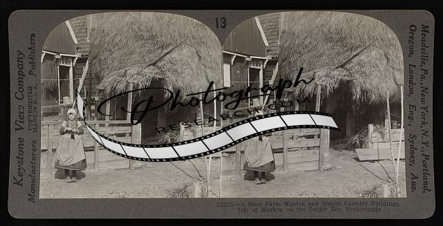 A busy farm maiden and quaint country buildings, Isle of Marken on the Zuider Ze
