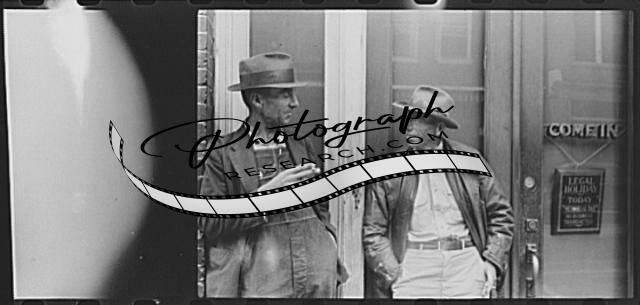 Title: Two farmers talking in front of a bank in Roxboro, North Carolina
