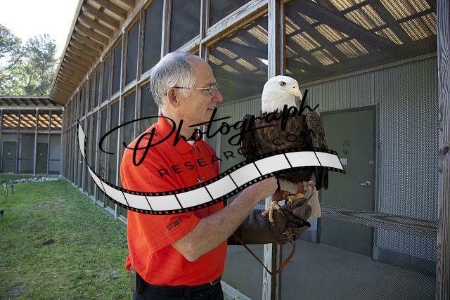 Title: Roy Clay Crowe poses with eagles who are brought into the Southeastern Raptor Rebilitation Center, University of Auburn, Alabama