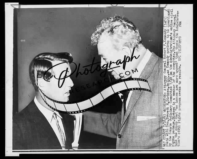 Attorney General Robert Kennedy [left] is greeted by Sen. Everett Dirksen as he arrives to testify before the Senate Judiciary committee today