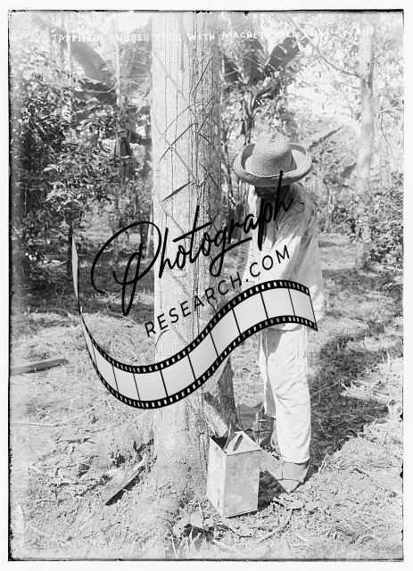 Photograph of Tapping Rubber Tree with machete (Old Way),man,knife,Bain News