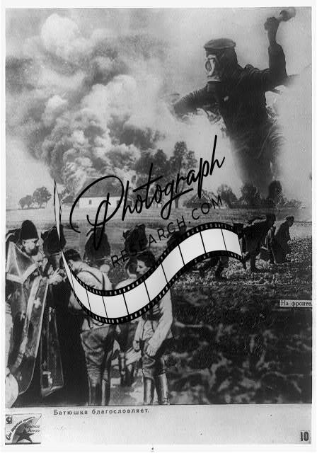Batyushka blagoslovlyaet,Na fronte,soldiers,gas masks,burning house,Russian,1915