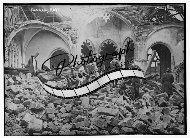 Church,Roye,France,people,rubble,damaged building,Bain News Service