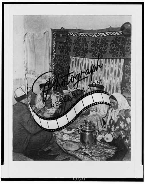 Family drinking tea,decorative wall hangings,back wall,homes,Kyrgyzstan,1957