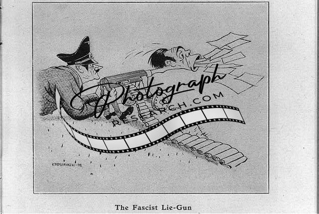 Cartoon, "the facist lie-gun", showing Goebbels as a Hitler-operated machine gun spurting out paper from his mouth