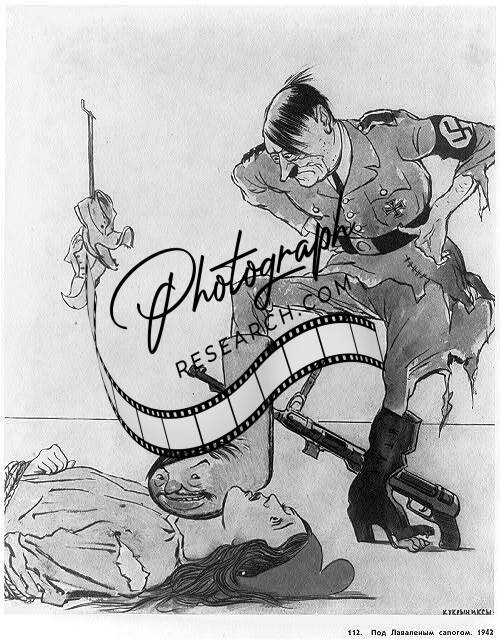 Russian cartoon, "the position of Laval" showing Laval as Hitler's boot standing on the neck of La France. 1942