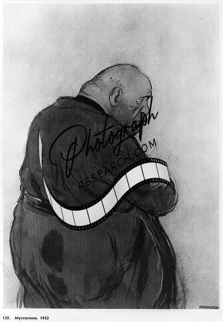 Mussolini; three-quarters length, standing, Russian caricature, facing rear