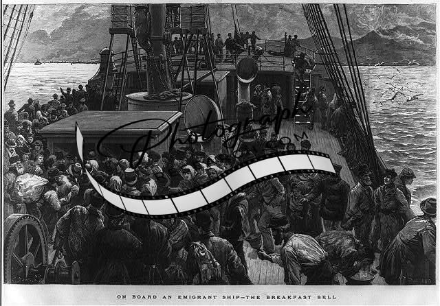 Emmigrant ship,breakfast bell,immigrants,ship deck,1884