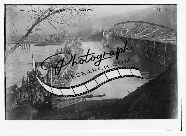 Wrecked Bridge over Morawa,Poland,damage,horse drawn wagons,men,rubble,ship