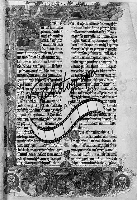 Page of medieval Bible with various border illuminations of New Testament scenes