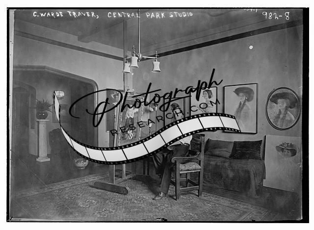 Painting studio of C. Warde Traver,Central Park,New York,man sitting with easel
