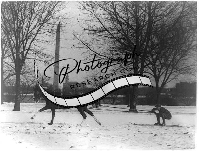 Man on Skis being pulled by horse,Washington Monument,Washington,DC,1919