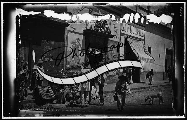 Pulque shop,bars,La Floapura,buildings,streets,dogs,crates,Tacubaya,Mexico,1880