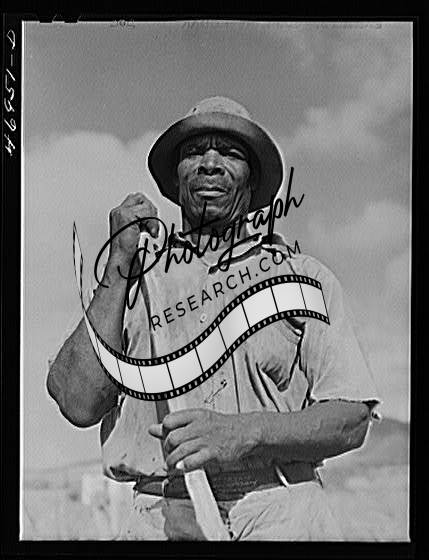 Title: Frederiksted (vicinity), Saint Croix, Virgin Islands. FSA (Farm Security Administration) borrower cultivating his sugar cane field. He lives in one of the homestead houses