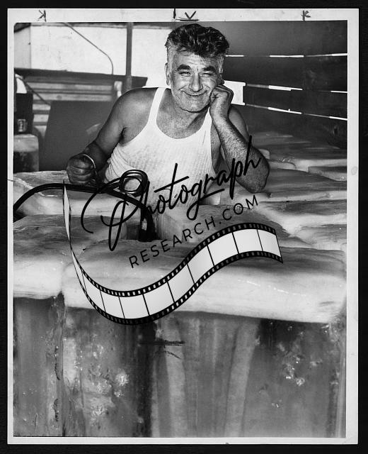 James Letini,an ice handler at Fulton Fish Market,holding ice hook,1959,smiling